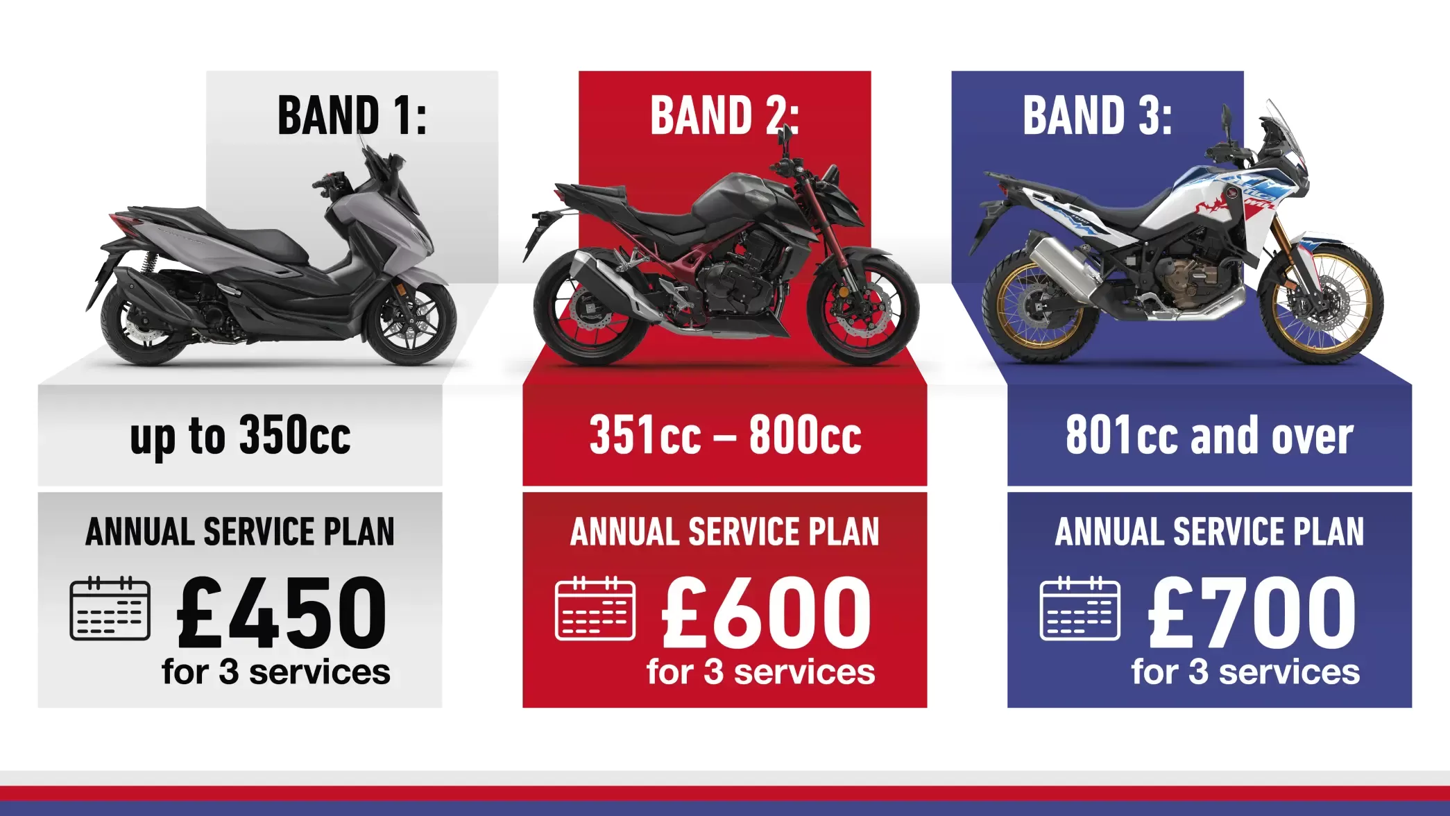 We know how hard it is to plan for the unknown. That’s why our Honda Service Plan has been designed for New Honda Motorcycles and Scooters, to maintain them in line with the Honda manufacturer’s service schedule. A one-off inflation-proof payment will see your New Honda Motorcycle or Scooter through its first 3 services and to make things even simpler, we have separated our models into 3 price bands based on engine capacity. The prices are fixed, so you know exactly how much you will be paying in advance leaving you to get on with enjoying your bike.
