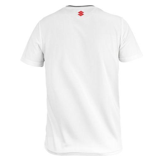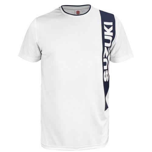 White sportive T-shirt, breathable, with blue printed stripe and Suzuki lettering, 100% polyester.