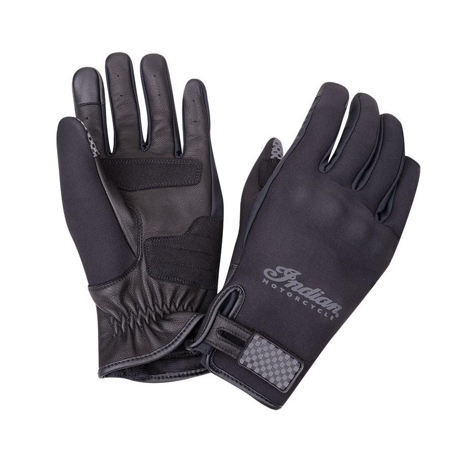 This is a sporty riding glove with leather palm and neoprene back of hand construction. This glove offers hard knuckle protection.