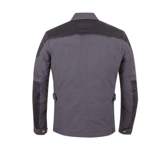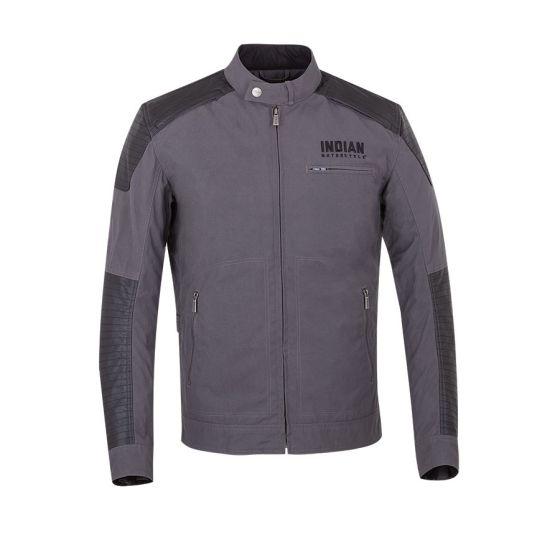 This is a lightweight waxed textile riding jacket. Contrast leather details on shoulder and sleeves. Ventilation zips on front and back seam yoke to keep cool in warmer temperatures and a removable padded liner for cooler days.