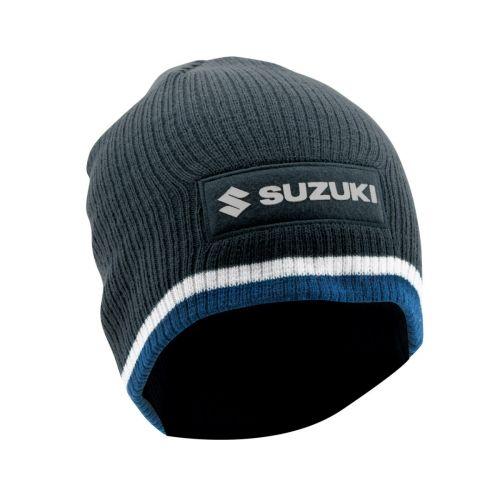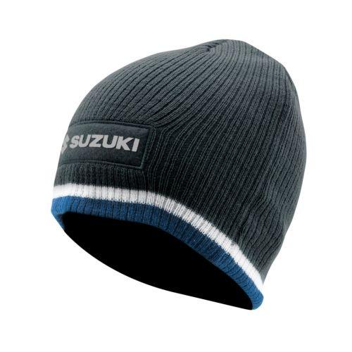 Melange blue Beany with white and blue stripe on the bottom and a white suzuki logo and lettering in the front, 100% acrylic. ONE SIZE