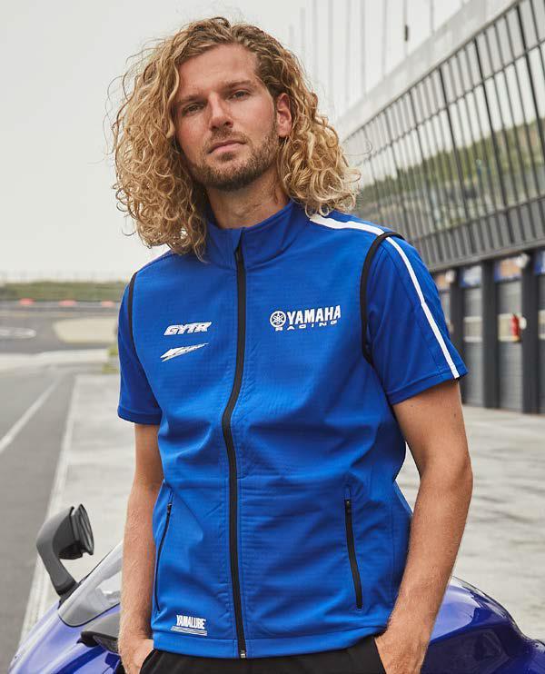 The Paddock Blue softshell bodywarmer is designed to keep you warm in the wind and cold. The comfortable bodywarmer is lined with waffle-structure fleece and carries white Yamaha Racing logos on the chest and various design elements in black and white.