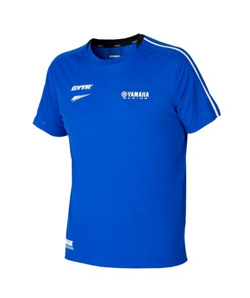 Quick-dry, high-quality Paddock Blue T shirt, designed for and worn by our Yamaha Racing team crew. Smart and comfortable. The pique shirt has printed, white Yamaha Racing logos on the chest and sleeve, and features various black and white design elements.